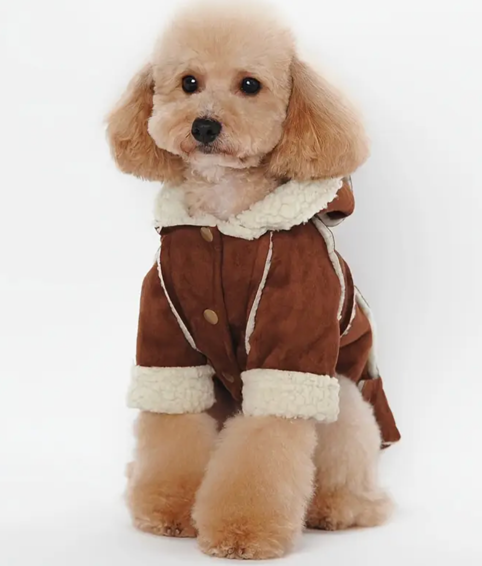 Keep your small dog warm and stylish with this cozy British-style thickened jacket. Featuring a soft fleece lining and a convenient hood, it offers excellent insulation against cold weather. The snap closure ensures a secure fit, while the charming brown and white accents add a classic touch.
