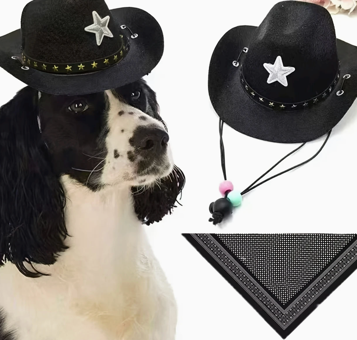Dress your furry friend in style with this charming pet cowboy/girl hat and bandana.