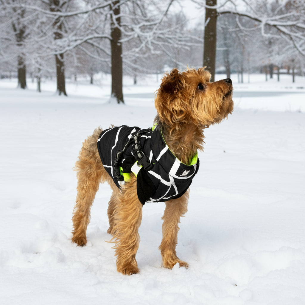 This neon-accented jacket features a sleek design with high-visibility elements, ensuring your pup stands out wherever they go.