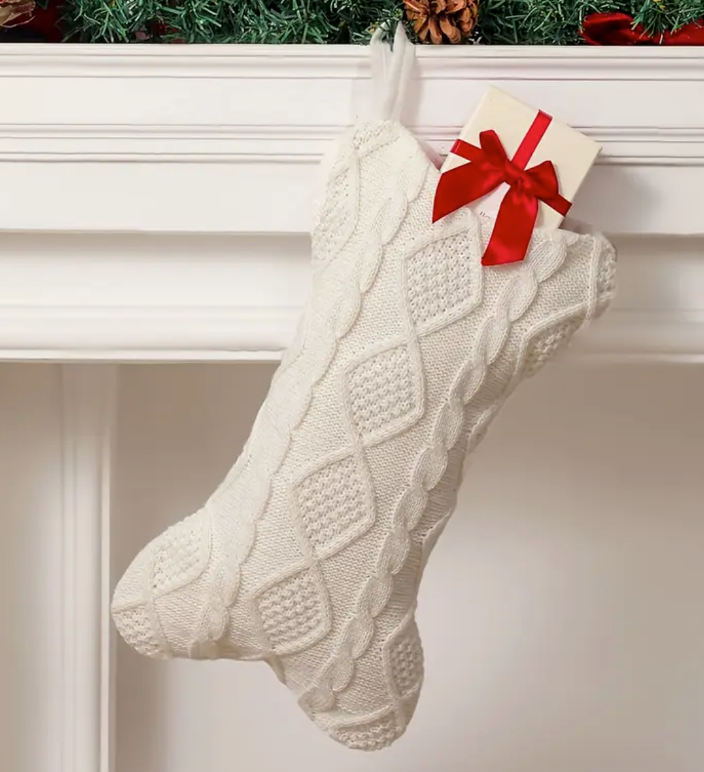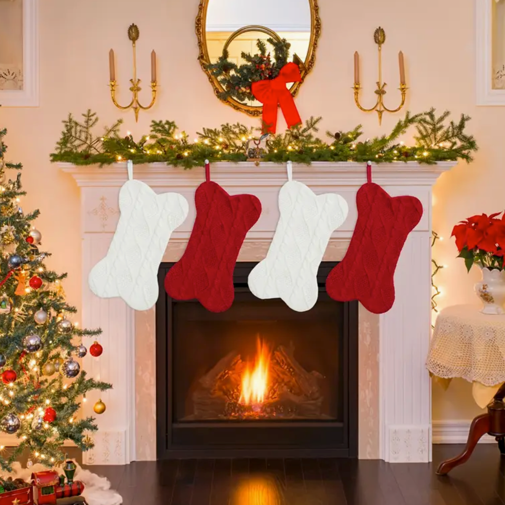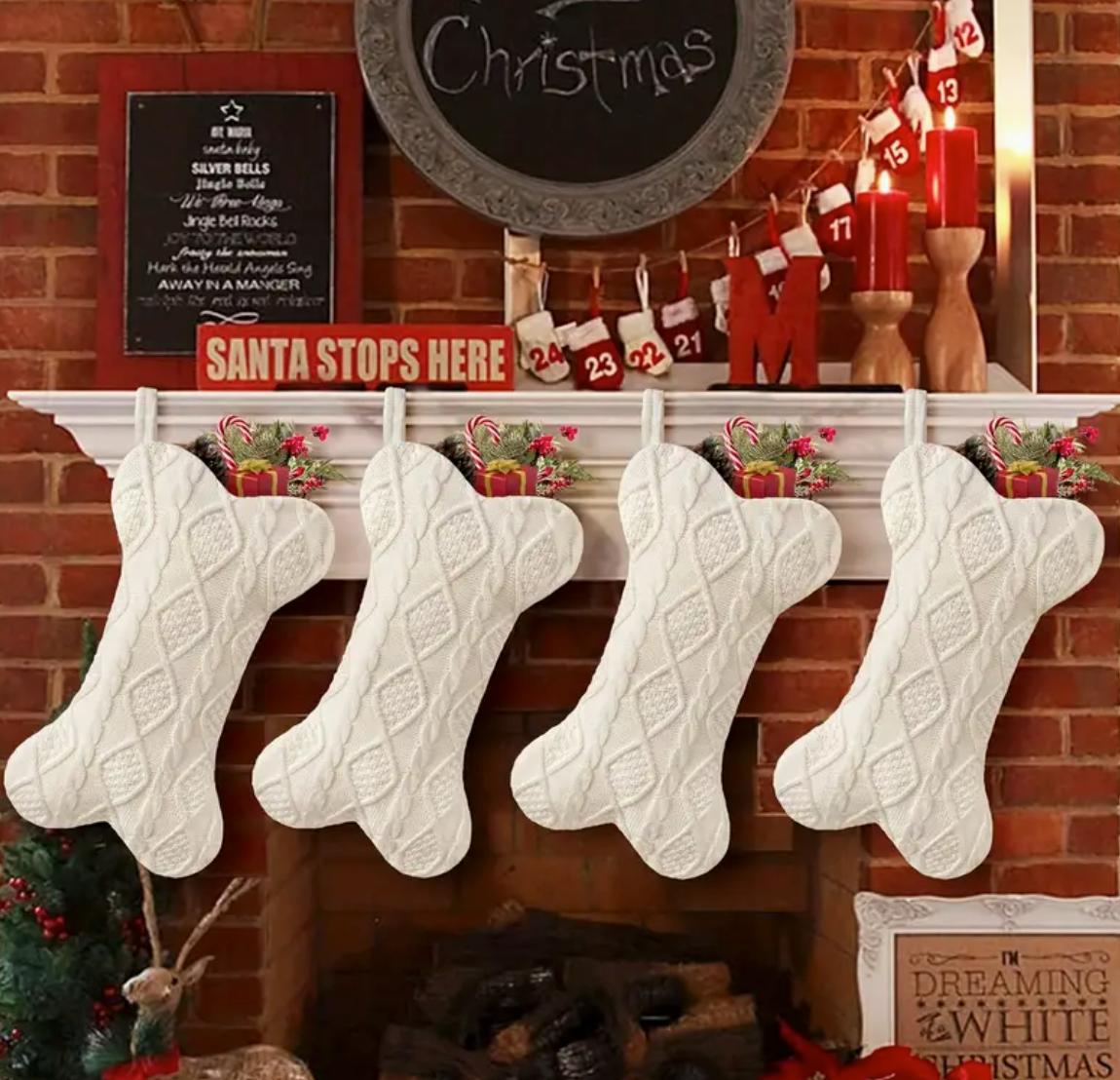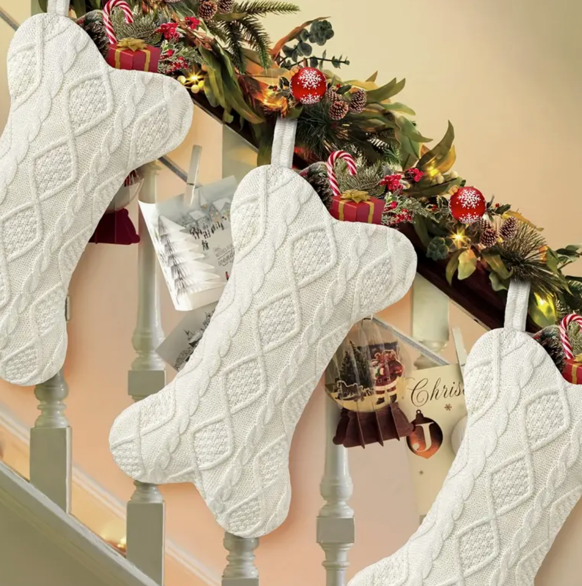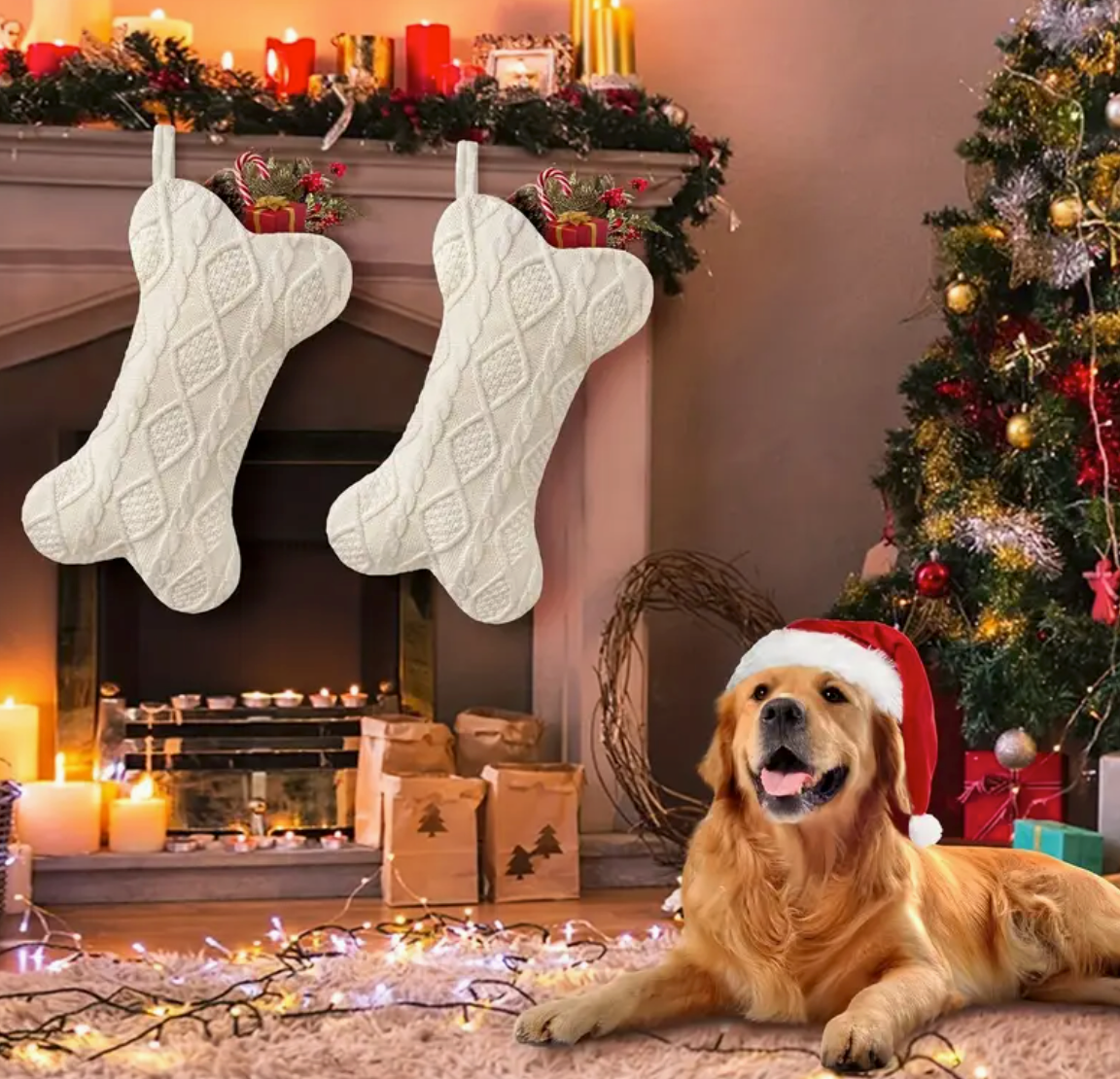 Celebrate the holidays with this charming Knit White Christmas Stocking, designed in a playful bone shape perfect for your furry friends.