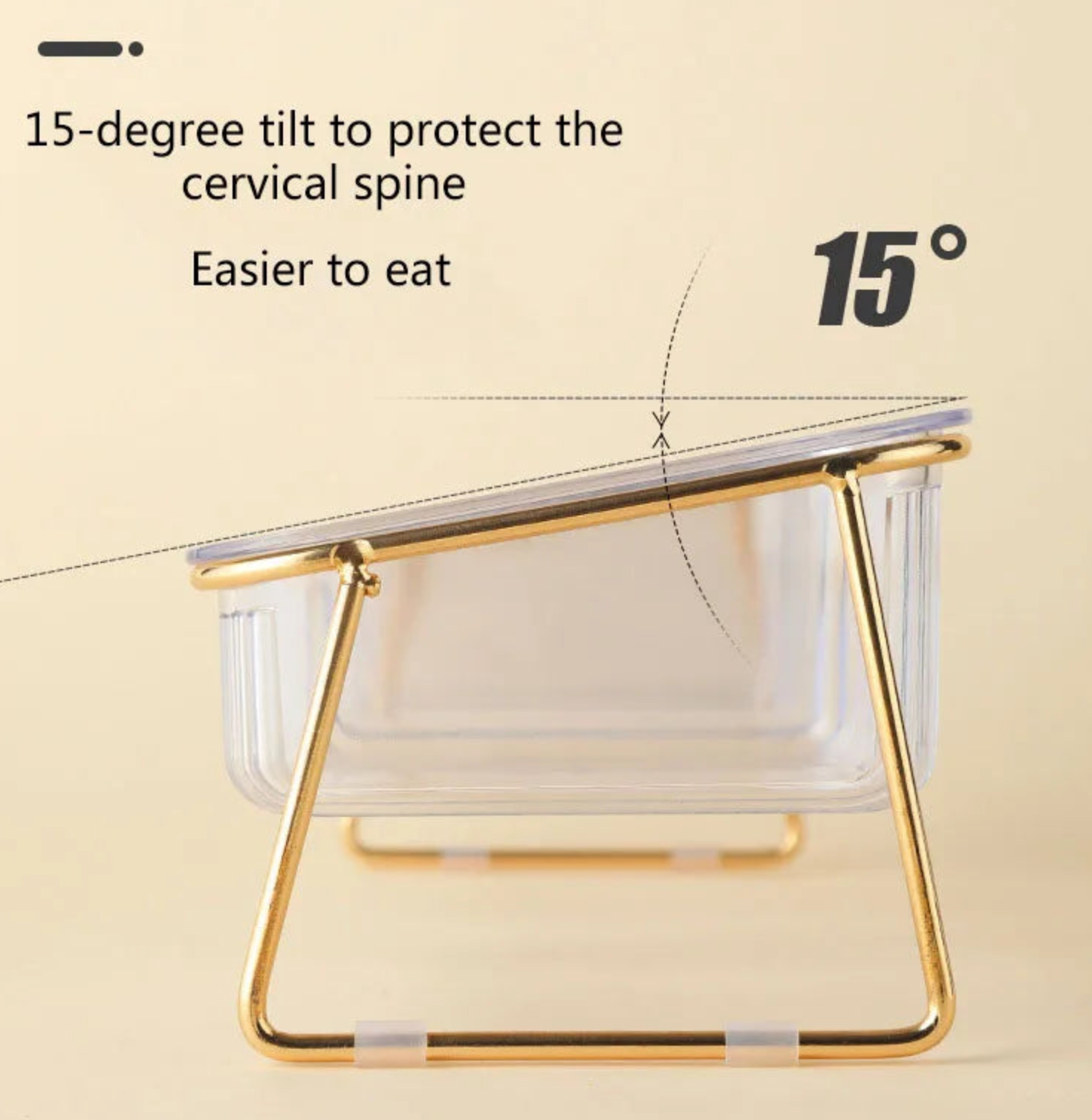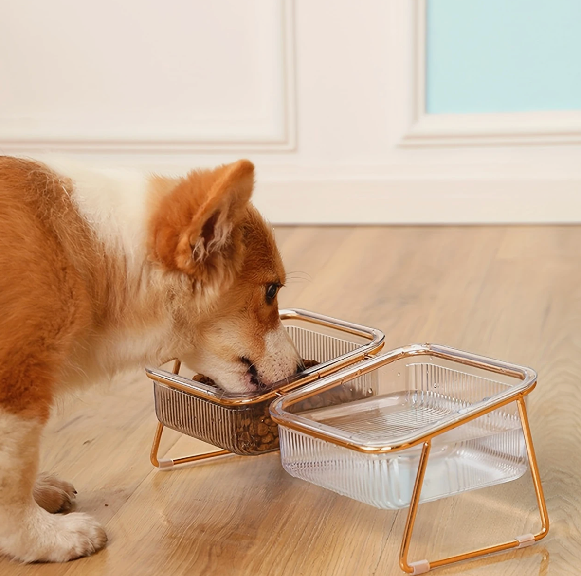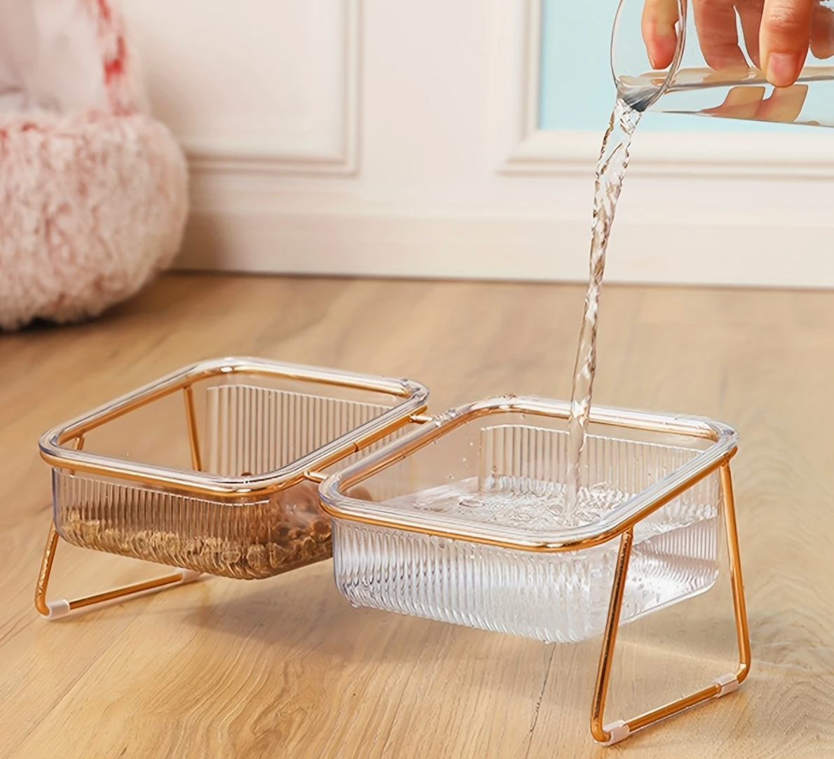 Elevate your pet’s dining experience with these modern feeding bowls featuring elegant gold trim and a clear design.