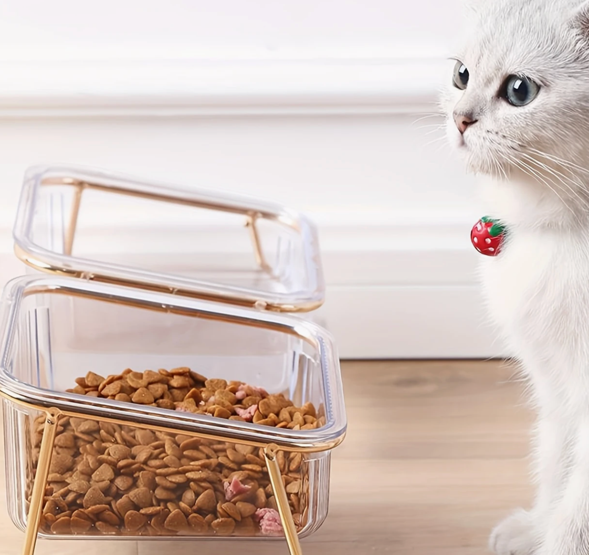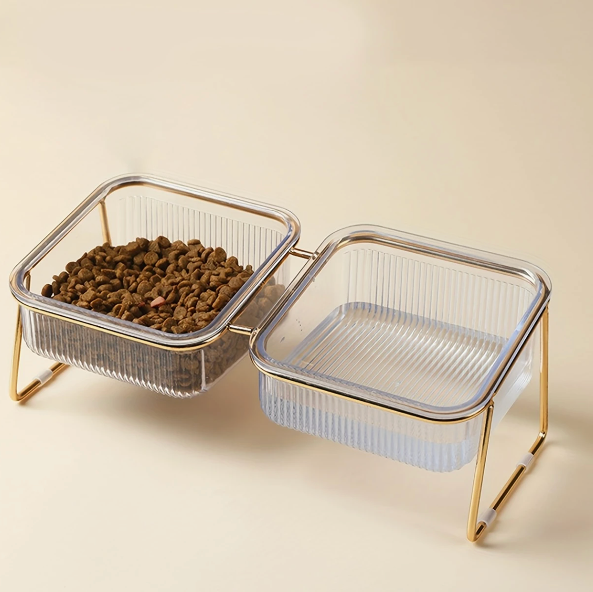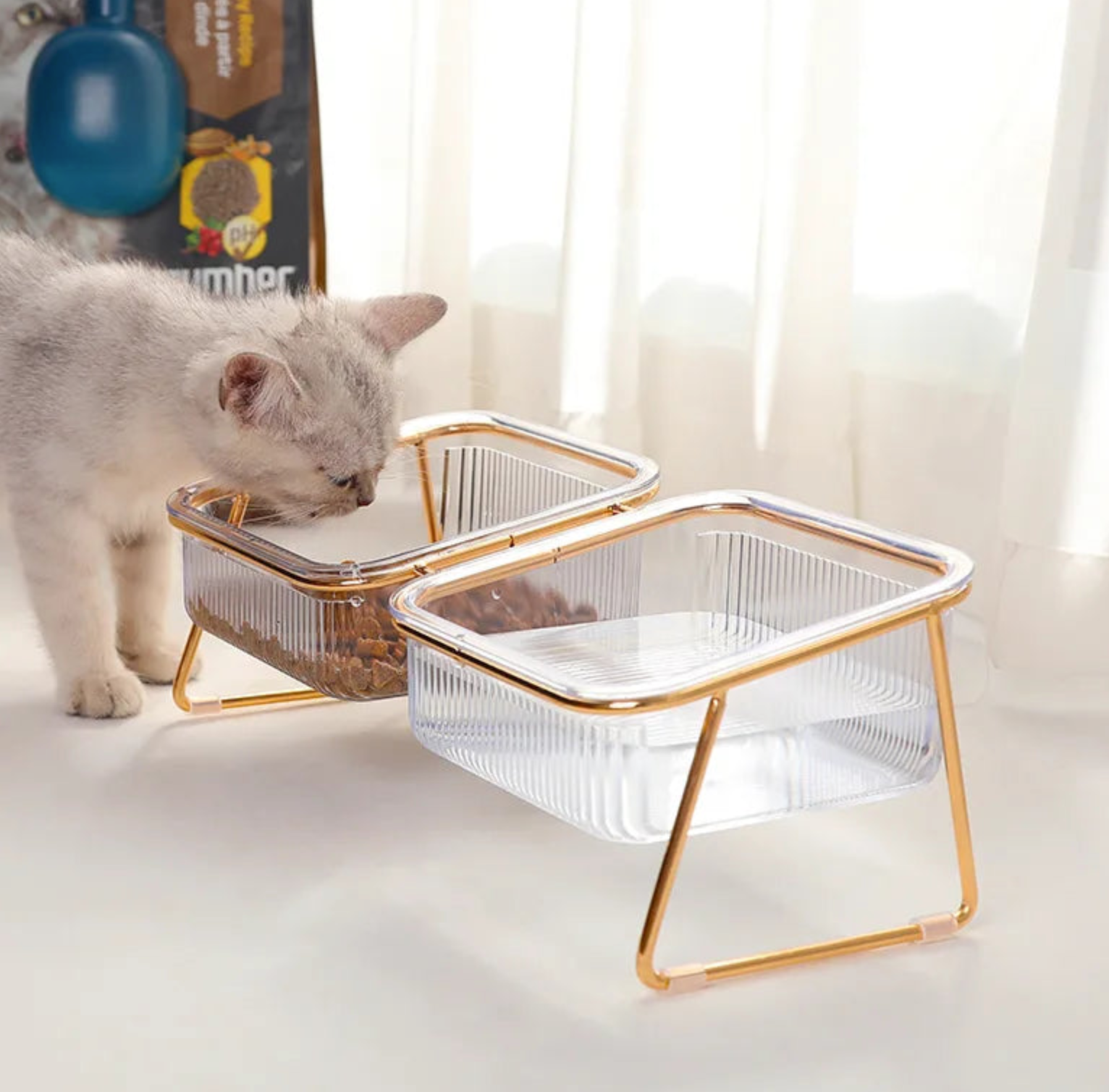 Elevate your pet’s dining experience with these modern feeding bowls featuring elegant gold trim and a clear design.