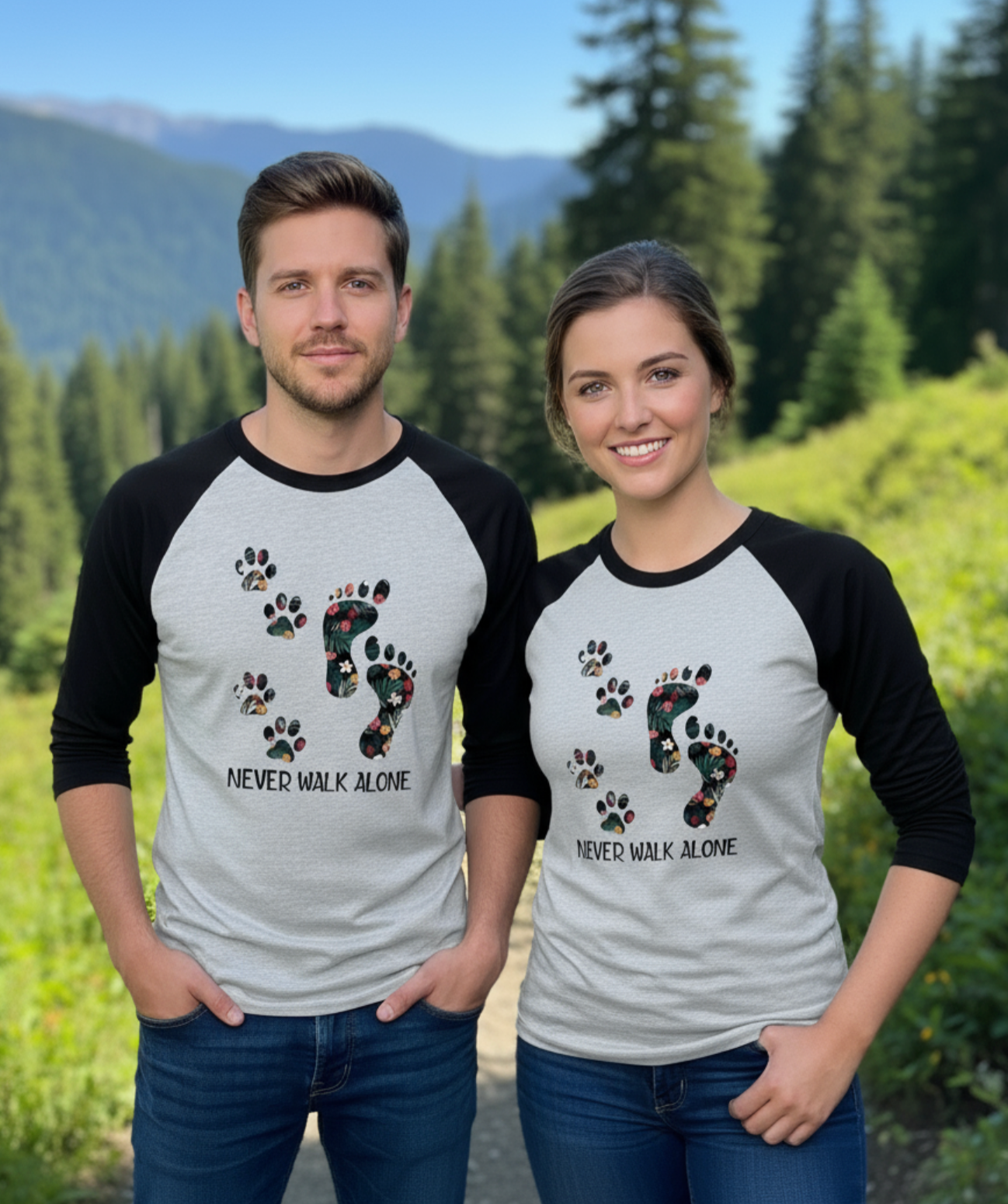 For every pet parent who knows the joy of loyal paws by their side, this Never Walk Alone baseball tee is made just for you. With classic 3/4 length sleeves and a sporty look, it’s perfect for walks at the park, casual days out, or cozy moments at home with your furry best friend.