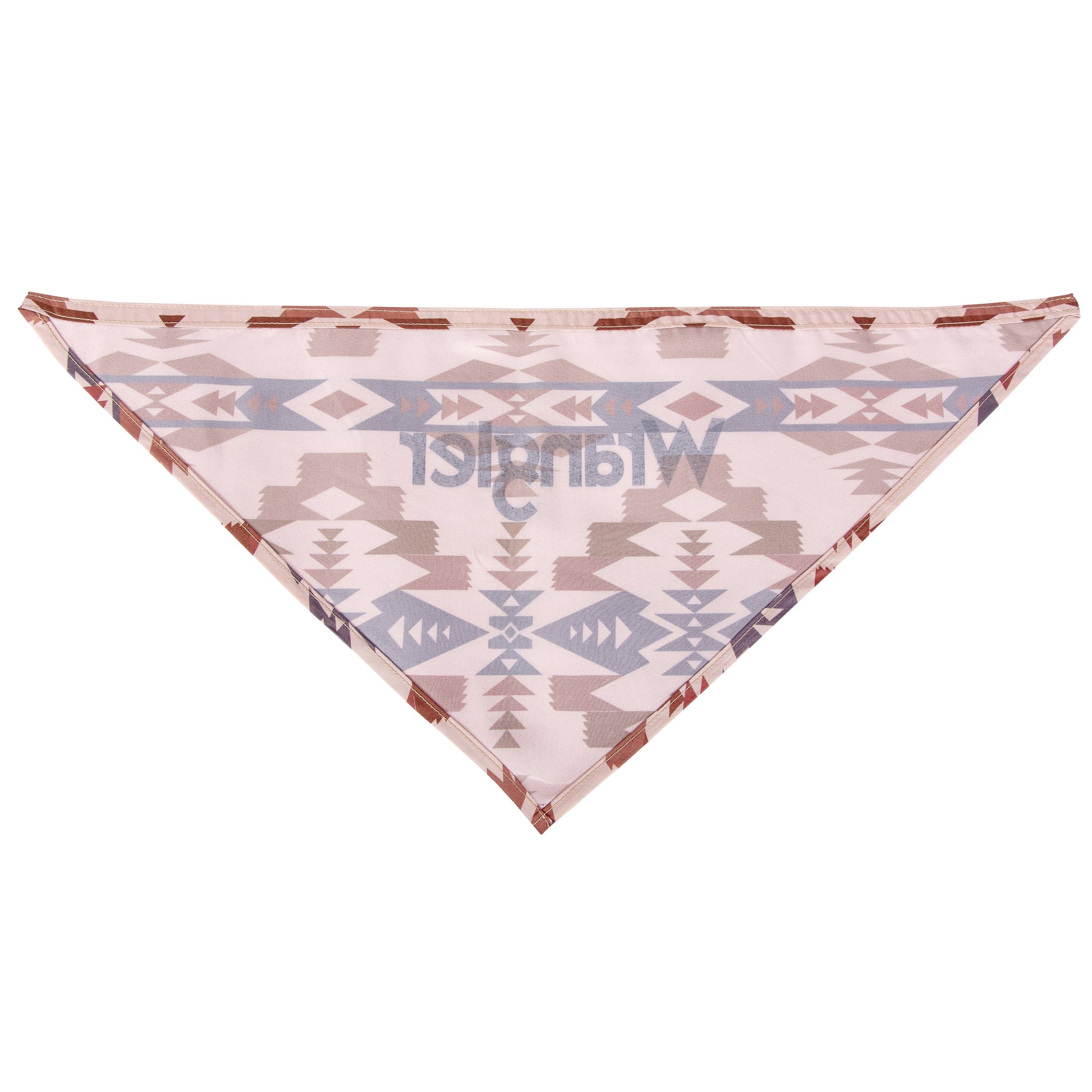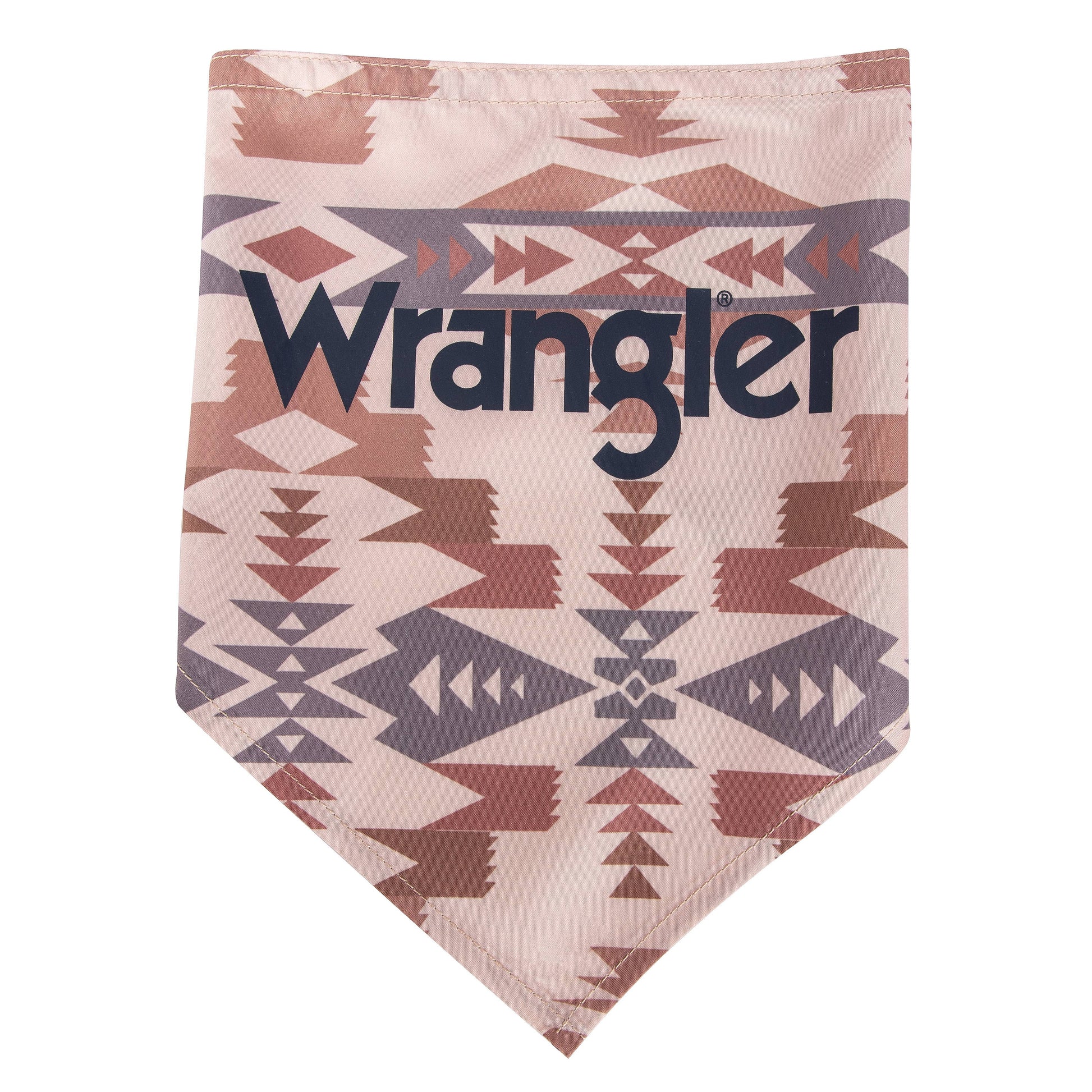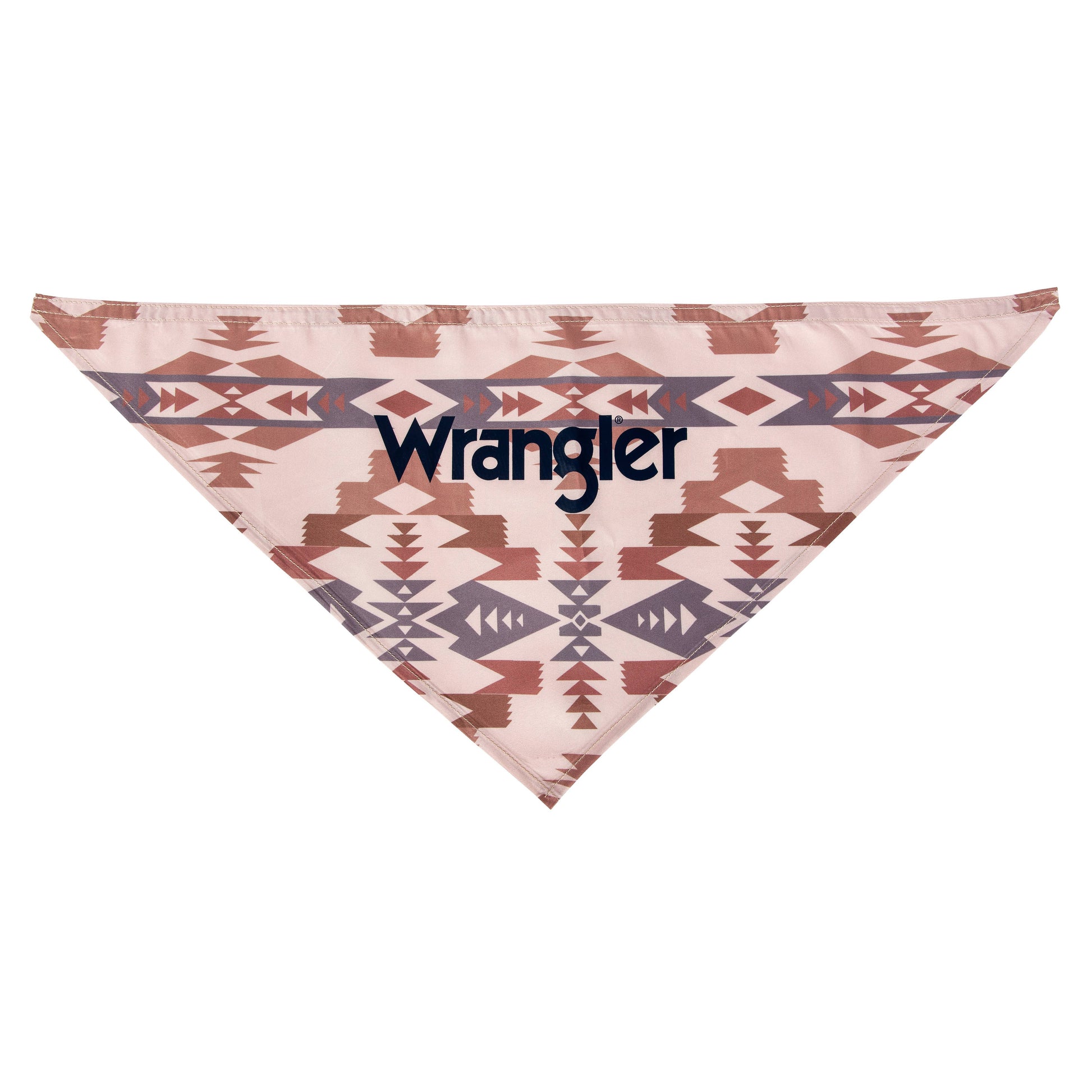 Show off your dog's style with this Southwest patterned bandana, complete with Wrangler® logo. Made of soft touch polyester poplin with a brown toned print and contrasting Wrangler® logo. Machine wash cold, gentle cycle. Non-chlorine bleach, when needed. Tumble dry low. Best performance results: hand-wash cold with mild detergent. Lay flat to dry. Dimensions: XS-S 19'' around neck, and 8.5'' length to point, M-L 26'' and 12.5'', XL 36'' and 14''.
